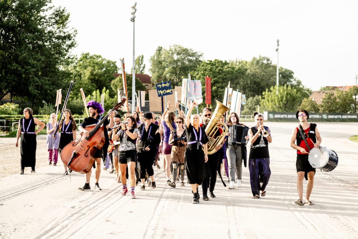 The PROFIT ORCHESTRA emerged in 2020–21 from the community project Lauratibor in Berlin’s Kreuzberg neighborhood. Today, the band consists of 10–15 international musicians. Each member contributes their own themes, so that the program has evolved into a kaleidoscope of current political struggles and utopian visions. Concern for friends and relatives in Tehran, the fight against the displacement of a beloved bar in Berlin, fear of rising poverty, anger over repression against anti-fascists, and much more make up the intense mix of issues that shape our lives and often leave us feeling desperate. In our music, we bring this wild collection of emotions together and express it. It’s not just us, all over the world, people find strength in music to keep fighting.